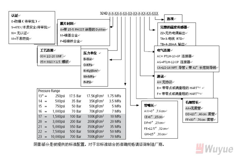 輸出,模擬:4-20mA(標準壓力,溫度可選) 輸出,數(shù)字:HART 綜合精度(錯誤)(20-100%滿量程): ±0.25%滿量程(3M和3M以上) ±0.35%滿量程(1.5M和1.5以下) 溫度漂移(77-572℉,25-300℃): 0.001%滿量程/℉,最大(0.001%滿量程/℃,最大) 重復(fù)性:±0.1%滿量程 爆破額定壓力:2X滿量程 超壓 額定:1.5X滿量程 量程:1,500至10,000psi 可調(diào)范圍:6:1調(diào)節(jié)比,向下 負載電阻:250歐姆@18Vdc;500歐姆@23Vdc |