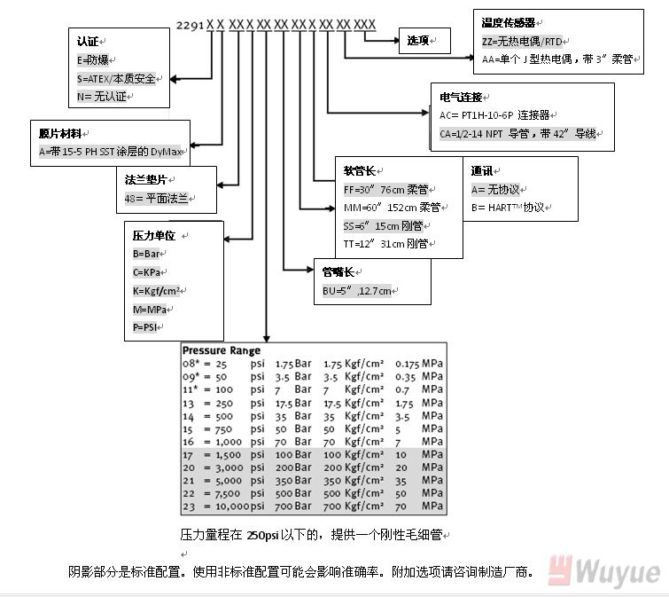 輸出:4-20mA,帶有可選的HARTTM數(shù)字通訊系統(tǒng) 輸入電壓:16-36Vdc(標準) 16-30Vdc(ATEX/本質安全應用軟件) 綜合誤差:+/-0.20%FSO ( 包括線性,重復性&滯后現(xiàn)象) 重復性:+/-0.1%FSO 再調范圍:3:1調節(jié)比,向下 超過壓力:小于7,500psi時:2X FSO ,10,000psi時:1.5xFSO 零點調整量程:-40%至+10%;小于500psi時是-80%至+20% 增益調整量程:+/—2%FSO最大 負載電阻:500歐姆@26Vdc1000歐姆@36Vdc |